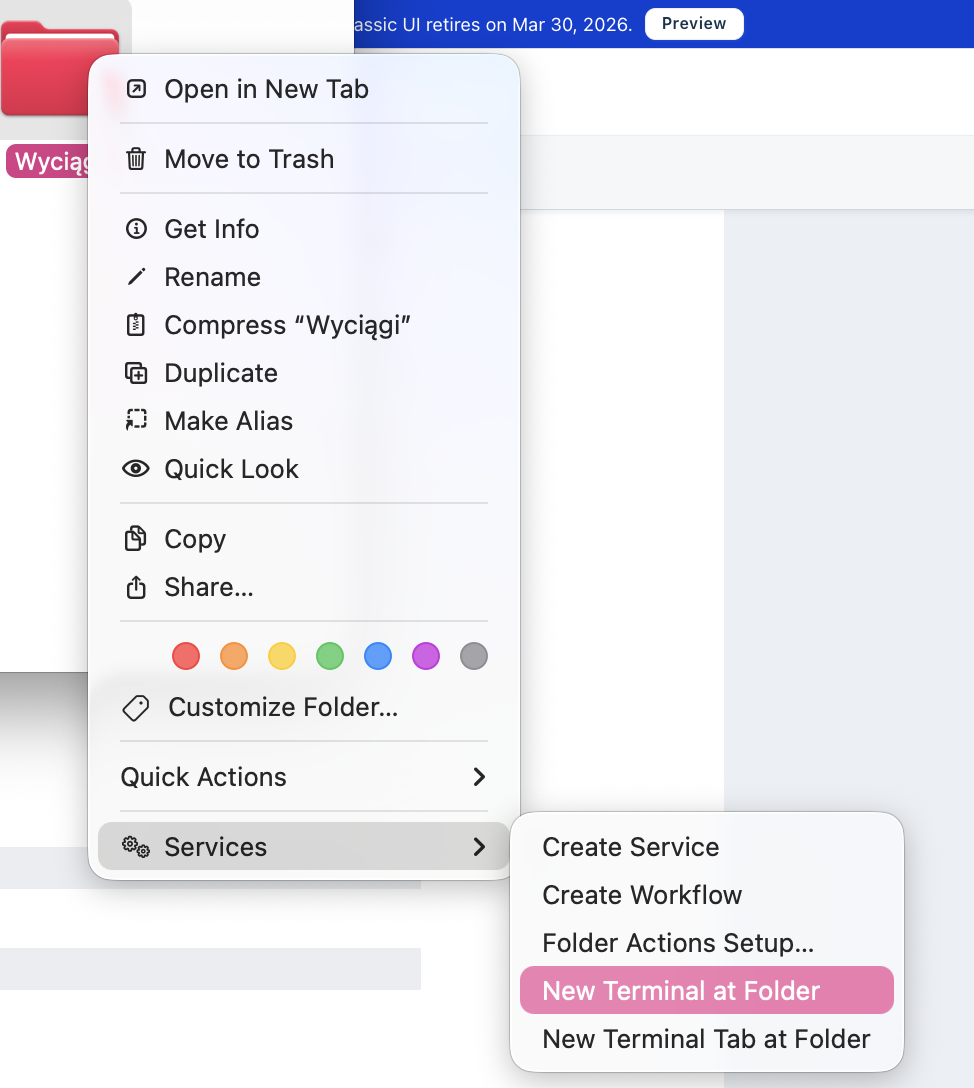 Next, double click on the folder, click on SERVICES and NEW TERMINAL AT FOLDER: